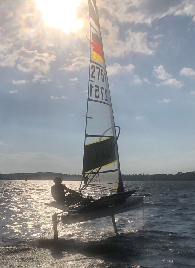 Um bei perfekten Bedingungen noch einen weiteren Begeisterten in den Bann des Foilens zu ziehen, habe ich mit Mike Przybyl aus unserem Buli-Team eine erste Probesession auf meiner WASZP gemacht.