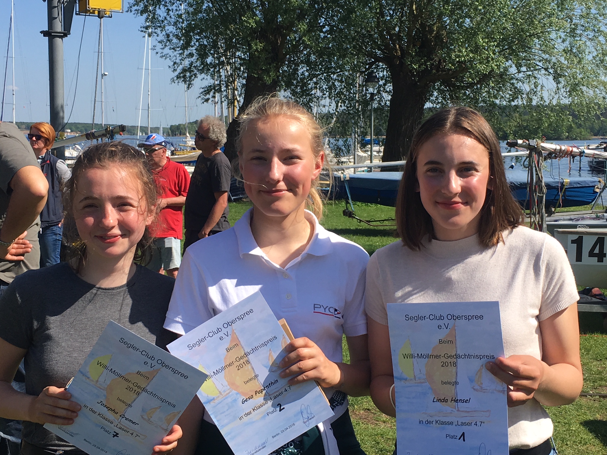Gleichzeitig fand auf der Havel der Willi Möllmer Gedächtnispreis vom SC Oberspree in Kladow statt. Der PYC mit seiner mittlerweile sehr großen Lasertruppe war unter der Betreuung von Hannes am Start. Im Laser Radial zeigte Eli mit Platz 2, dass ihn das Abi seglerisch eher beflügelt und er nachwievor in Topform ist. Albert rundete das Ergebnis mit einem 6. Platz ab. Bei den 4.7 ließ Gesa nach zwei Regattasiegen in Folge ihre Trainingspartnerin von der TSG, Linda Hensel, ziehen und beendete die Regatta auf dem 2. Platz. Insgesamt waren 10 Seglerinnen und Segler aus der Trainingsgruppe am Start! Als nächstes folgt für die Laser ein Trainingslager über Himmelfahrt in Kiel und anschließend die YES (ehemals Pfingstbusch). Die Opti sgeln in Plau und dann bei unserem eigenen Pfingsfestival im PYC um Punkte.