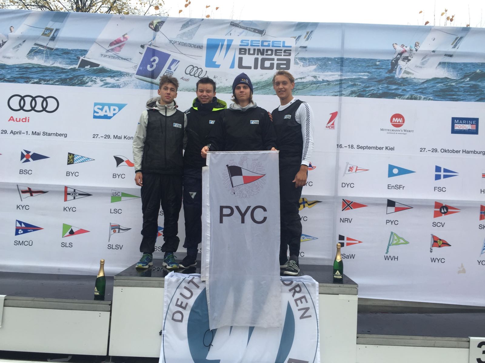 Gestern Aufstieg in die erste Bundesliga der "Senioren" und heute Vizemeister der Junioren. Im Finale der Juniorenbundesliga wurde das PYC Team mit Freddie Eichhorst, Moritz Paschen, Leander Kamm und Paul Estrada Pox am heutigen Montag in Hamburg hinter dem Bayerischen Yacht Club Zweiter. Ein toller Erfolg nach der schon beeindruckenden Qualifikation im Sommer auf heimischen Gewässern. Das häufige und regelmäßige Training der Crew auf der clubeigenen J70 hat sich bestens ausgezahlt, stand doch so ein eingespieltes Team am Start. So kann es bei der ersten Teilnahme an der ersten Bundesliga der Senioren im Jahr 2017 gerne weitergehen. Herzlichen Glückwunsch an das Team!