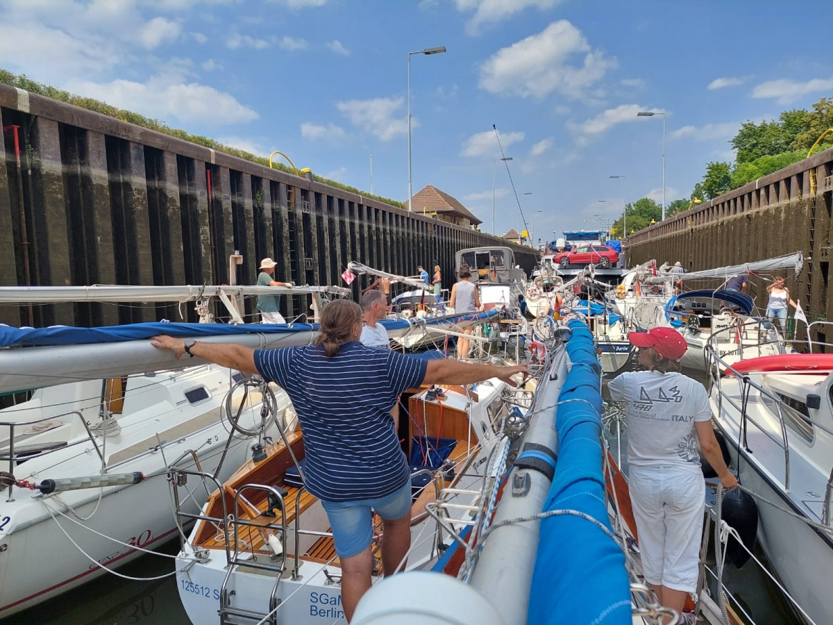 Am nächsten Morgen ging es weiter in Richtung Schwedt. Im Schiffshebewerk Niederfinow waren wir, nach nur 20 Minuten Wartezeit, alleine. Der Weg bis zur Hohensaatener Schleuse verlief ohne besondere Vorkommnisse. Während wir am Haltepunkt für Sportboote festmachten, rief aus dem Lautsprecher ein etwas rüder Schleusenwart, wir müssten auf dem Knopf drücken, wenn die Schleuse geöffnet werden soll. Etwas verwirrt, wir waren ja noch nicht soweit, fragten wir nach, ob wir jetzt trotzdem noch den Knopf drücken sollen. Er hatte uns da offensichtlich bemerkt. Nein, aber wir sollten vorfahren, war die Antwort. Also lösten wir die Leine wieder und fuhren vor die Schleuse. „Jetzt muss ich aber mal schimpfen! Wie wollen Sie denn vor der Schleuse die Ampel sehen?" rief es unwirsch aus dem Lautsprecher. ???? auf unseren Gesichtern. Also wieder ran an die Haltestelle und, kaum festgemacht, sprang die Ampel auf Grün. Ein Glück waren wir als Crew gut gelaunt und eingespielt. Nachdem die Schleusentore aufgingen, warteten wir artig auf die grüne Ampel … ??? ... bis die vor der Schleuse wartenden Boote sich anschickten hineinzufahren. Aufgrund des vorherigen Verhaltens des Schleusenwarts fragten wir über Funk an, ob wir rausfahren dürften. „Ach, ist noch nicht Grün? Habe ich wohl die Lichter verwechselt. Fahren Sie bitte vorsichtig raus." Gesagt, getan. In Schwedt angekommen haben wir die halbe Crew, wie geplant, abgesetzt und uns zu zweit am nächsten Tag auf den Weg nach Stettin gemacht. Hans-Joachim hatte uns über WhatsApp mitgeteilt, dass die Leute in der Marina Hotele bei ihm keine gute Arbeit beim Maststellen geleistet haben. Daher entschieden wir uns kurzfristig um und ließen den Mast beim AZS Stettin stellen. Eine gute Entscheidung, da der Bootsmann ein kompetenter Mann ist, hat alles recht schnell und ohne Schäden geklappt.