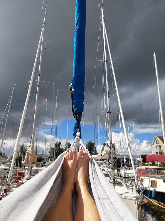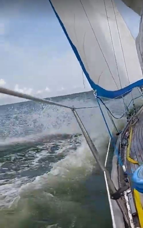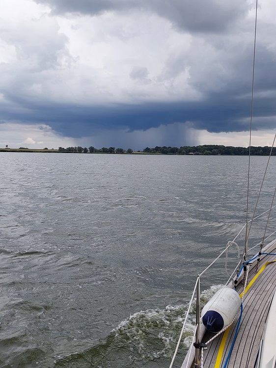 Long story short, in Ückermünde angekommen, ging der Besuch von Bord. Ein Zeichen für uns, dem Urlaubsende entgegenzufahren. Auf nach Stettin, einer dunklen Wolkenwand vorweggefahren. Im Stettiner Haff wollten wir abkürzen und sind quer übers Haff gefahren. Die vielen Fischernetze waren uns bekannt, aber wow, das waren eine Menge! Lustigerweise sind wir unbewusst einem polnischen Segler hinterher gefahren, dadurch kamen wir gut um die Fischernetze herum. Er kannte sich sehr gut aus. Also ein heißer Tipp von uns: Wenn abkürzen, dann sucht Euch einen polnischen Segler, der in die gleiche Richtung möchte.