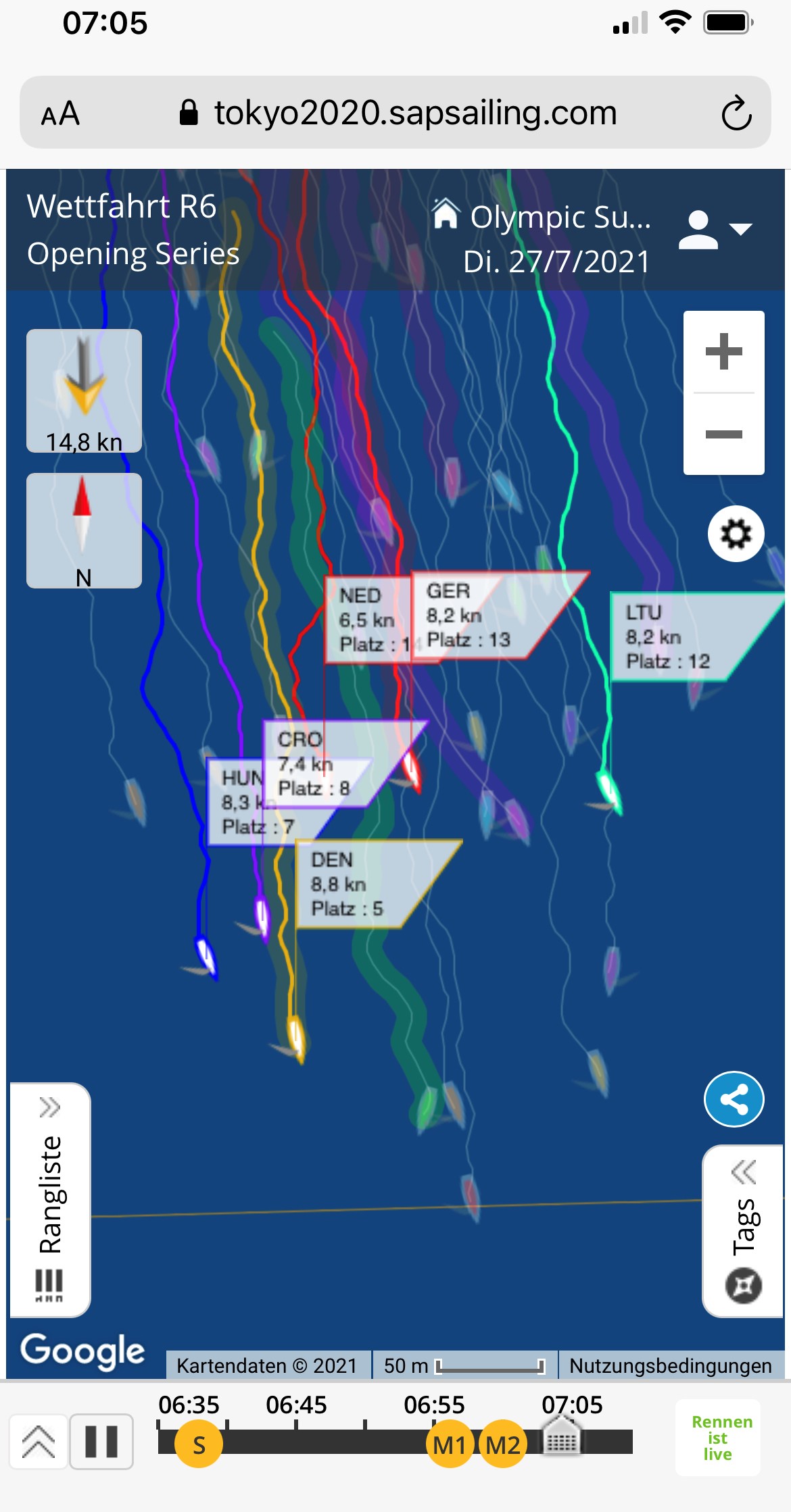 Die letzten beiden Rennen stehen an, bevor es übermorgen im Medal Race um die Medaillen gehen wird. Die Bedingungen völlig anders als gestern. Leichtwindbedingungen in der Bucht von Enoshima bei 5-7 Knoten. Also fast wie am ersten Tag. Das erste Rennen beginnt um 12:05 Ortszeit. Und in Deutschland reiben wir uns vor dem Fernseher (das ZDF berichtet live) noch die Augen, als Svenja im ersten Rennen wieder eine Aufholjagd startet. Mit einem guten 12 Platz ist sie vor dem letzten Rennen auch in der Gesamtwertung 12. Das Feld wieder einmal durcheinandergewirbelt. Vorne die erst 18 jährige Israelin und die Favoriten teilweise weit zurück.