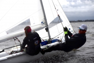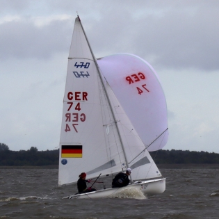 Am nächsten Tag war 12 Uhr Start. Zusammen mit den Junioren und den anderen Teilnehmern der Kehraus Regatta segelten wir bei Wind zwischen 20-25kn um die Wette. Zwei Rennen sind wir gefahren, in denen wir uns 2 zweite Plätze ersegelten. Danach hatte der Wind noch bis über 30kn zugenommen. So kenterten wir zwischen dem zweiten und dritten Rennen, wobei unser Mast leider ziemlich verbogen ist. Das Steinhuder Meer ist nämlich zwar ein gutes Segelrevier, jedoch ist der Wasserstand extrem niedrig.