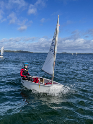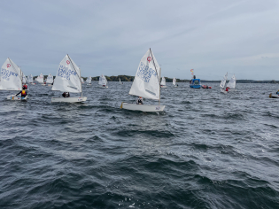 Der Sonntag präsentierte sich von einer ganz anderen Seite. Der Wind hatte deutlich aufgefrischt und dunkle Wolken zogen am Himmel auf. Zwischendurch überraschten uns auch immer wieder kurze Schauer. Nicht gerade Bedingungen, die junge Opti-Herzen jubeln lassen. Einigen schlug das Herz schon deutlich bis zum Kragen des Trokos, gut gedämpft von den darunter getragenen Fossis. Ich hatte die Gelegenheit genutzt und für diesen Tag beim Trainer angeheuert. Eigentlich war ich sehr begeistert, endlich mal vom Wasser aus das Geschehen verfolgen zu können aber auf der anderen Seite sehr froh, dass ich nur aus der beobachtenden Perspektive vom Mobo das Geschehen verfolgen und meine Hände in der wärmen Jackentasche verstecken konnte.